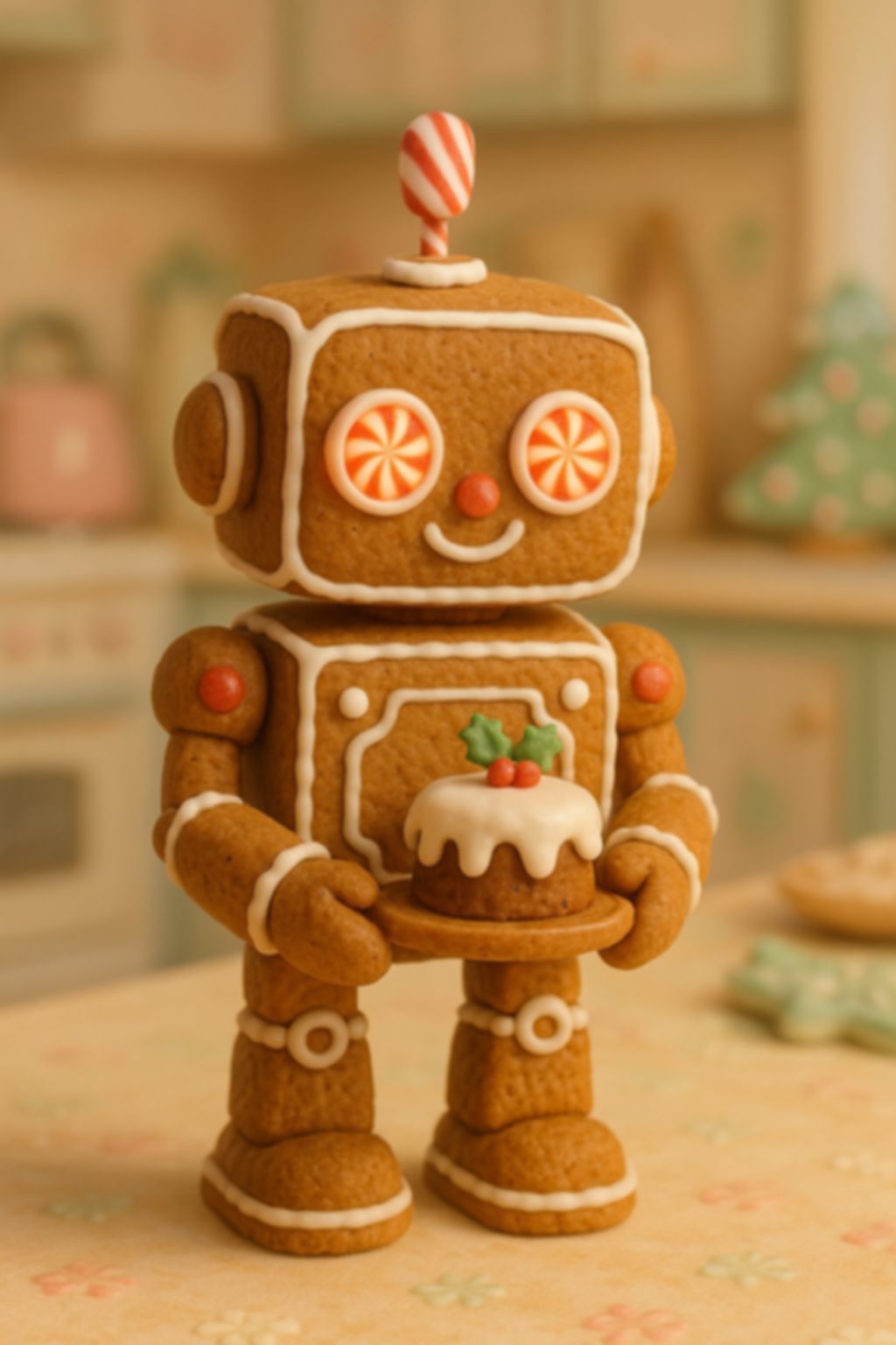 Adorable holiday robots, neon gifts, sci-fi vibes.